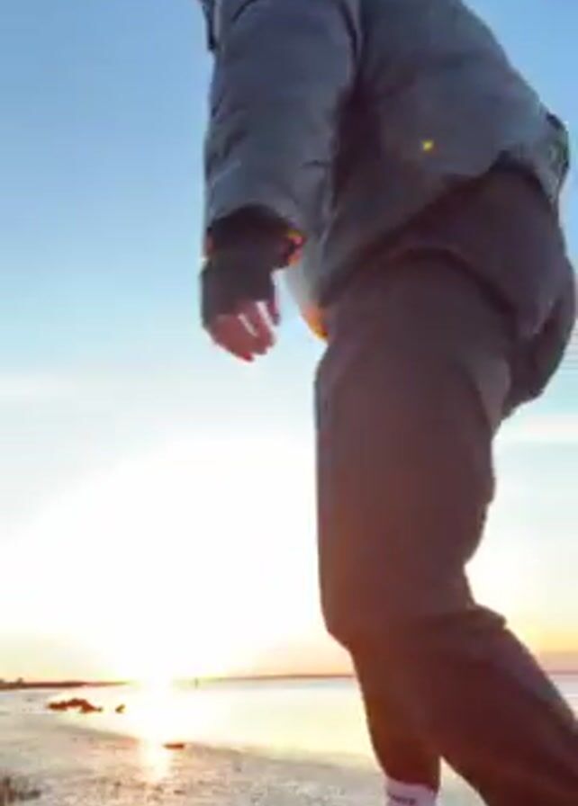 person walking towards a sunset over a body of water. The person is wearing a dark-colored hooded jacket, dark pants, white socks, and shoes. They walk on what appears to be a beach or frozen ground. The sun is setting on the horizon, creating an orange glow across the water and sky. There are a few objects scattered on the ground. The sky is a clear blue with some wispy clouds. The person stops near the water's edge and places their hands on their hips, looking at the sunset.