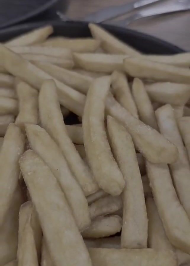 table in a restaurant with a meal laid out on it. The meal consists of a large plate of french fries, a glass of cola with ice and a straw, a plate of coleslaw, and a plate of fried chicken. The plates are black and the table is a light brown wood. There is a set of silverware in the background.