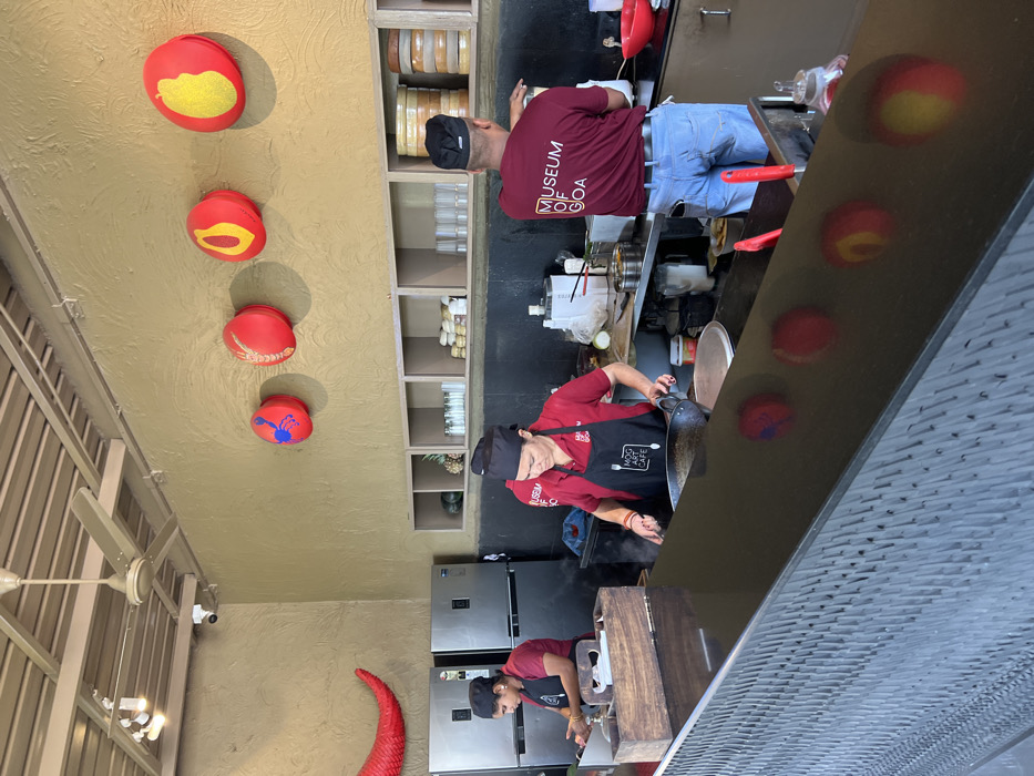 interior of a restaurant kitchen, with a black countertop and a textured black wall. Three people are present. A woman in a red shirt is standing at the counter to the left, while another woman in a red shirt and black apron is cooking at the counter, stirring something in a pan. To the right, a man wearing a red shirt with the words "Museum of Goa" on it, is standing in front of a stainless steel counter with a white container. The kitchen is well-equipped with a stainless steel counter, cabinets, and a sink. It has a ceiling fan with a light fixture. There is a white wall with a row of five round decorative pieces, one blue and four red. The image was taken at the coordinates 15.526, 73.795 which is located in a neighborhood in the city of Marra, India.