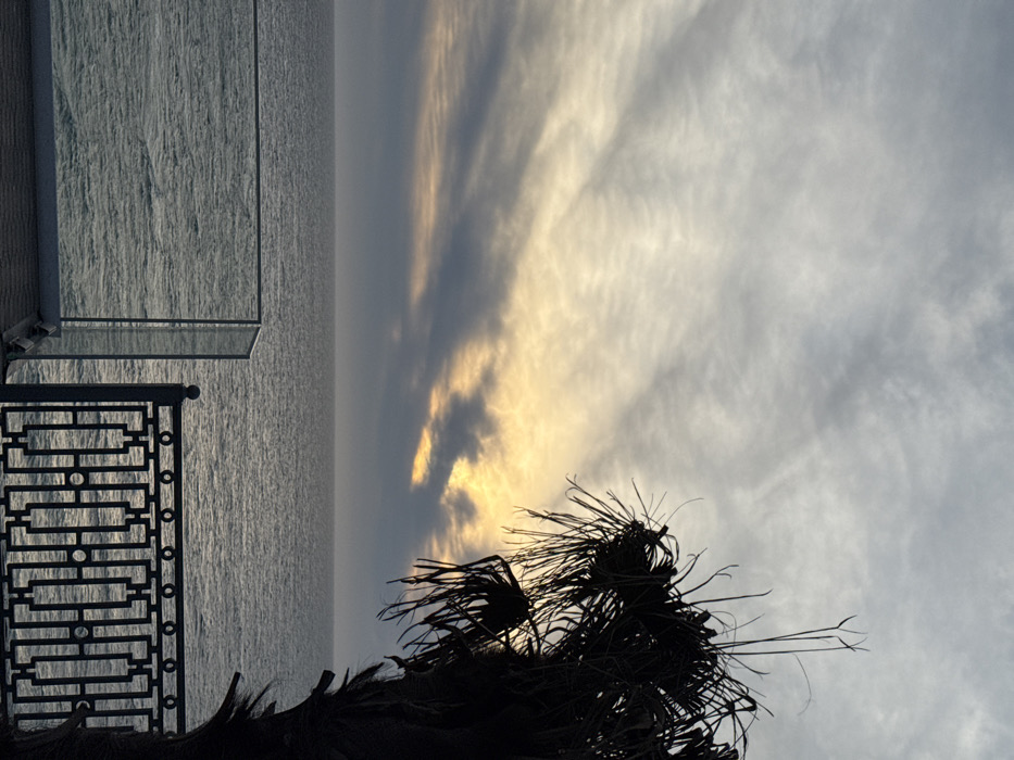 The image captures a coastal scene in the city of Anapa, Russia, during what appears to be either sunrise or sunset. The sky is extensively overcast with layered clouds; a distinct band of bright yellow-orange light, indicative of a low sun, is visible near the horizon, partially obscured by darker, dense cloud formations. Above this, lighter gray clouds display subtle wave-like patterns. Below the horizon, a vast expanse of dark, choppy water, likely the Black Sea, stretches across the frame. In the immediate foreground, a dark, ornamental metal railing with repeating rectangular and circular patterns occupies the lower right section. To its left, a clear, frameless glass panel barrier is present. The silhouette of a palm tree, featuring a dark trunk and sparse, spiky fronds, dominates the far right side of the frame. No individuals or specific actions are depicted.