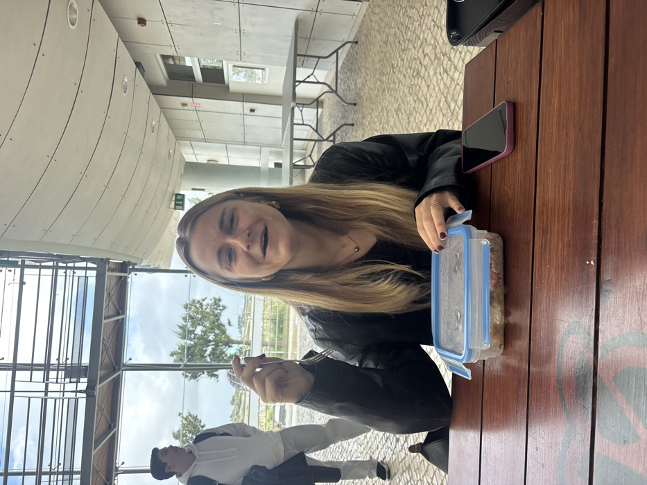 An interior scene in a modern building located in Porto Salvo, Portugal, depicts a young adult female seated at a brown wooden table, smiling directly at the camera with her mouth slightly open