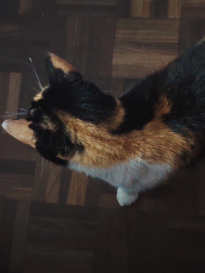 - "An overhead shot shows a calico cat standing on a parquet floor" by FM-DCPKH3, licensed under CC BY 4.0