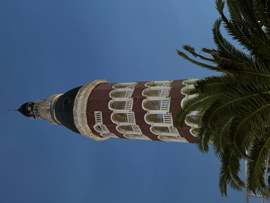 The image displays the Chacha Tower in Batumi, Georgia, set against a deep blue, twilight sky. The tower is a multi-story, cylindrical structure, predominantly red brick, featuring repeating patterns of arched white balconies with balustrades and columns on each level. The tower tapers towards its top, which consists of a dark, domed roof with an oculus, surmounted by a white, balustraded section, culminating in a dark, pointed spire with a finial. Artificial illumination highlights the tower's white architectural elements. A vibrant green palm tree occupies the foreground, its fronds partially obscuring the lower and mid-sections of the tower from the right and bottom of the frame. No individuals or discernible activities are present within the scene.