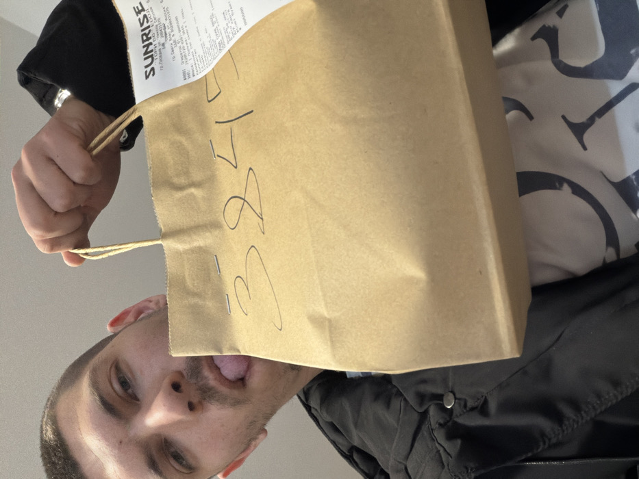 A male individual is captured in a low-angle, eye-level photograph, holding a brown paper bag towards the camera. The subject, possessing short dark hair and light facial stubble, has his tongue slightly extended from the left side of his mouth and is looking directly into the lens. He wears a dark, possibly black, puffer jacket over a light-colored t-shirt with dark patterns. His right hand, visible holding the bag's string handles, has a silver-colored ring on a finger. The brown paper bag has the number "3845" handwritten in black marker on its front. A white paper receipt is stapled to the upper right of the bag, identifying the establishment as "SUNRISE" located at "ГР.Свети Влас ул.Морска 1" (City of Sveti Vlas, 1 Morska Street), Sveti Vlas, Bulgaria. The background appears to be a plain, light-colored interior wall.