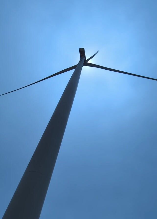 low-angle shot of a wind turbine against a blue sky