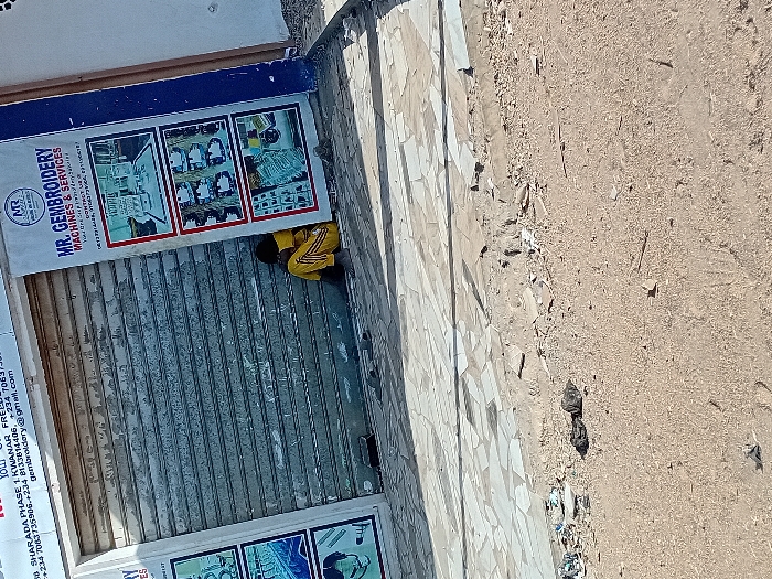 A daytime photograph captures a commercial storefront located at 58, Sharada Phase 1 Kwanar, Gandu Albasa, Nigeria. The shop entrance is secured by a closed, weathered grey corrugated metal roller shutter. Two vertical white banners flank the shutter. The right banner displays "MR. GEMBROIDERY MACHINES & SERVICES," along with Nigerian contact details and three images showcasing embroidery machinery and products. The left banner, partially visible, contains similar business information. A single individual, dressed in yellow and black striped attire, is seated directly on the tiled pavement, leaning against the closed roller shutter. Their head is bowed and obscured, indicative of resting or sleeping. The individual appears barefoot. The paved area transitions into an unpaved, dusty, sandy ground surface that contains scattered debris and several dark, unidentifiable objects.