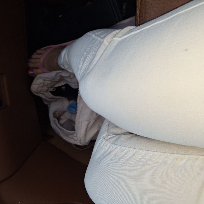 A close-up captures a person's leg clad in white pants, crossed at the knee. A pink flip-flop adorns the foot, toes painted a vibrant purple. A partially visible white jacket with a zipper lies next to the leg. The scene appears to be inside a car. The background is dark, with the seat appearing brown.
