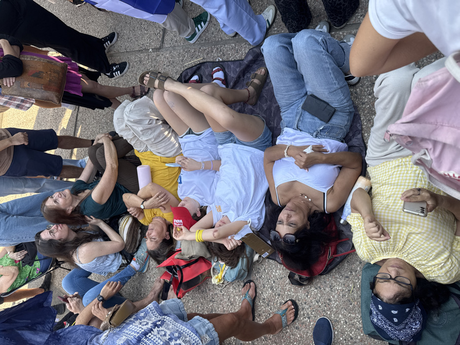 - "This outdoor image captures a public gathering of individuals, predominantly women, resting on a light-colored paved surface, likely concrete, in Tel Aviv, Israel, identifiable by the partial visibility of an Israeli flag (blue and white) on the right" by FM-Xpxot2, licensed under CC BY 4.0