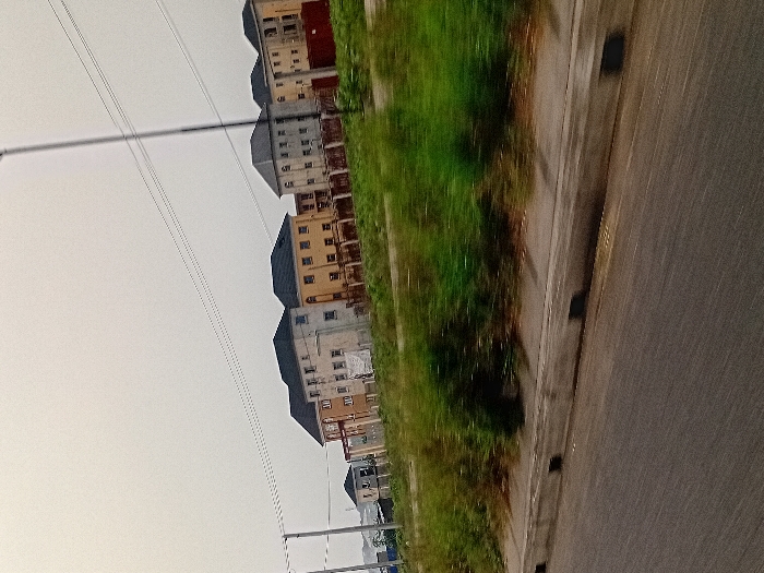 A row of buildings stands beside a grassy area, parallel to a road. The buildings are multi-story, painted in varying shades of yellow and beige with dark roofs. Tall, slender utility poles and wires run parallel to the buildings, diminishing in the distance. The sky is overcast, and the road appears wet and dark grey. Vegetation fills the area between the buildings and the road, with shadows present on the road surface.