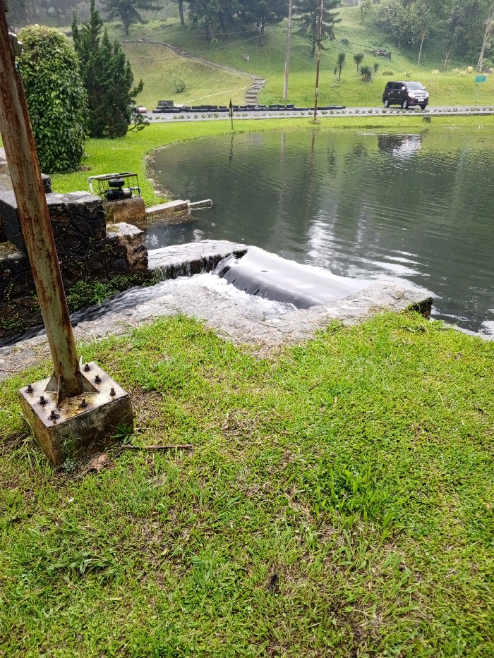 A water feature sits within a green landscape, with a tranquil body of water reflecting the surrounding scenery. A barrier, likely part of the feature's structure, causes water to cascade downwards. A black car drives on the road. Lush greenery lines the banks. A large metal post is situated to the side with bolts at its base. Steps lead upward from the banks.