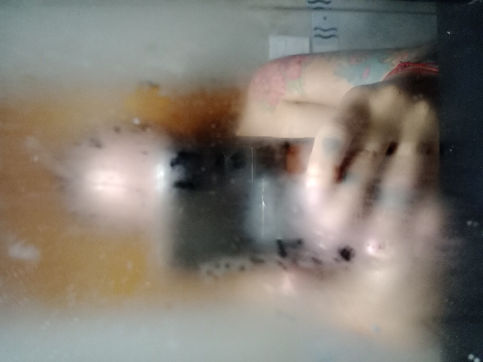A blurry image shows someone in a bathtub. A tattooed arm rests near the edge of the tub, with a hand partially submerged. There's an orange tint to the water, possibly from a bath product. Steam or condensation obscures much of the scene, but a black rectangular shape, likely a phone or device, is visible in the water.