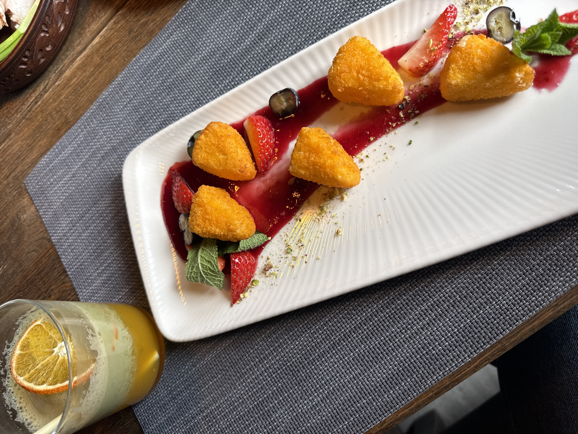 This image depicts an indoor table setting, purportedly located in Bucha, Ukraine. The scene features a white rectangular plate with a textured surface, holding seven golden-orange, breaded, triangular-shaped food items. A vibrant red sauce is artfully drizzled diagonally across the plate, accompanied by scattered green pistachio fragments, several fresh mint leaves, sliced strawberries, and whole blueberries. To the upper left, a clear glass contains a layered beverage, consisting of a lower opaque orange-yellow liquid and an upper frothy, light green-white layer, with a straw inserted and garnished with a single dried orange slice. Both the plate and glass are positioned on a dark gray, woven placemat, which rests on a dark-grained wooden table. A partial view of a decorative brown bowl with an embossed pattern, containing green elements, is visible in the upper right background. No individuals are present in the image.