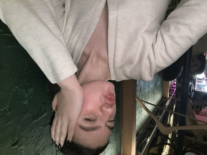 A rotated selfie of a woman wearing a light-colored sweater. She has one hand on her face, with dark nail polish. One eye is closed, and her lips are slightly puckered. Behind her is a green wall and what appears to be an alleyway or cluttered space with a chair, clothing rack, and miscellaneous items. A person is faintly visible in the background, possibly looking into the camera.
