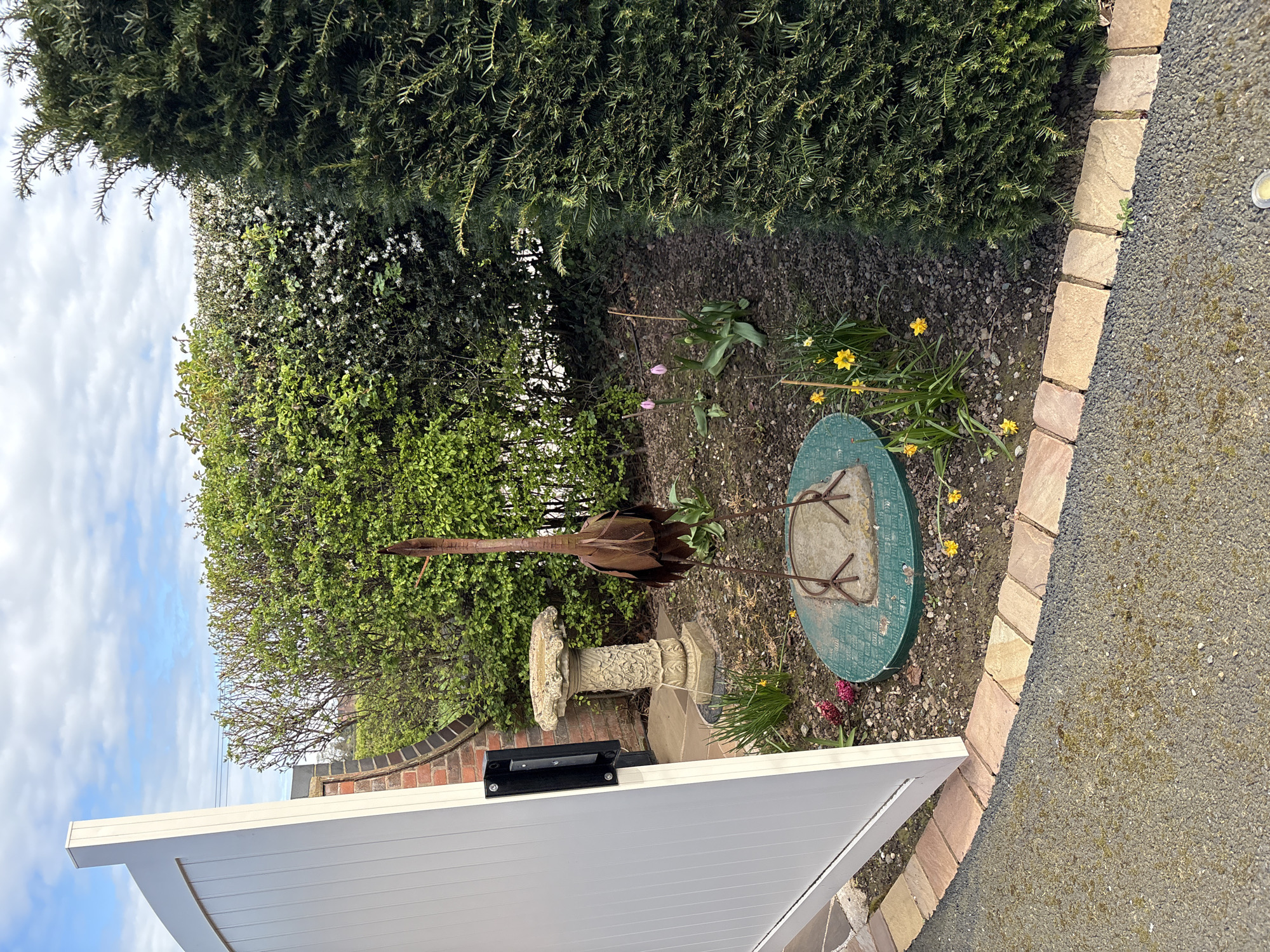 garden scene in Annscroft, United Kingdom. In the center is a rusty metal sculpture resembling a bird or ornamental plant on a stone pedestal. Behind it, a garden bed contains spring flowers like tulips and daffodils. A green metal disc with a metal frame is adjacent to the flowerbed, which is bordered by light brown bricks. The right side of the image shows a paved area with gravel. At the top, there are dense green hedges or bushes. Part of a white structure with a black metal attachment is visible in the bottom left corner. The sky is visible in the upper left, showing blue sky and light clouds.