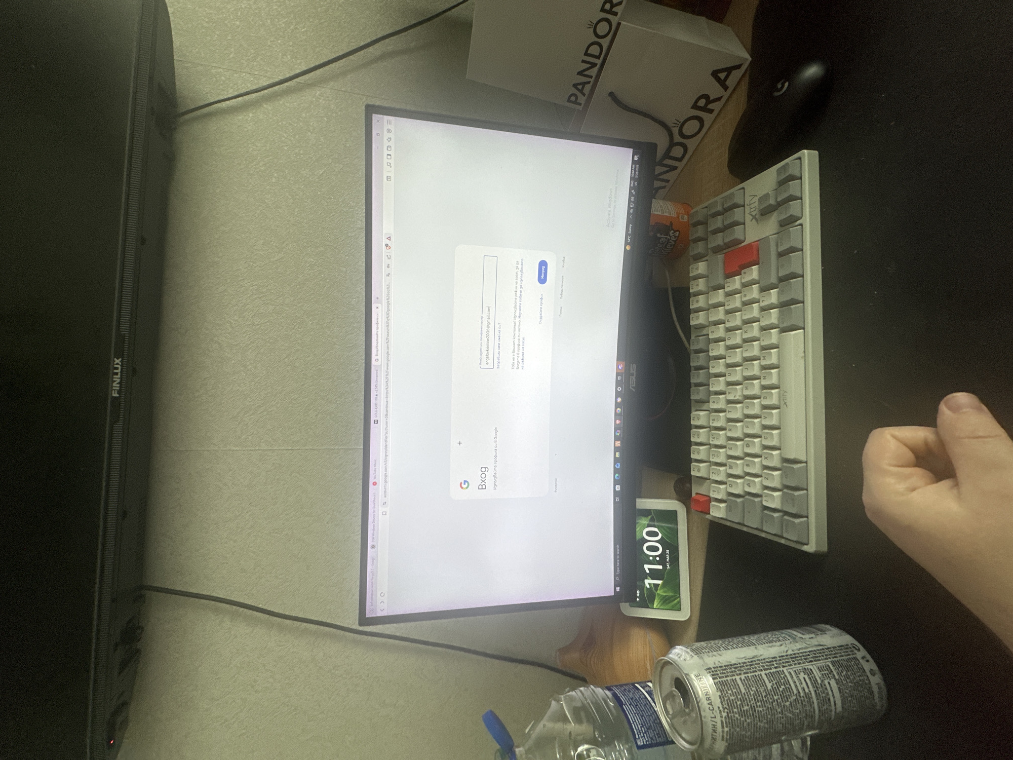 The scene depicts an indoor desk setup, identified as being in the city of Kozloduy, Bulgaria. A light-colored, textured wall serves as the background, with black cables descending from a black Finlux electronic device mounted above the desk. The desk features a central computer monitor (ASUS) displaying a Google Chrome browser window with a Bulgarian "Вход" (Login) page, partially showing the email address "angelovkristian2006@gmail.com" and an "Activate Windows" watermark. To the left of the monitor, a clear plastic water bottle and a silver beverage can with Cyrillic text indicating "ТАУРИН / L-CARNITINE" are present. Directly beneath the monitor is a white digital clock displaying "11:00 SAT, MAR 28" and a wooden diffuser. A light gray Xtrfy mechanical keyboard with one red keycap and a black Logitech G mouse rest on a black desk mat. To the right, two white Pandora shopping bags and an orange package are visible. A human right hand, with fingers slightly curled, rests on the black desk mat in the foreground.