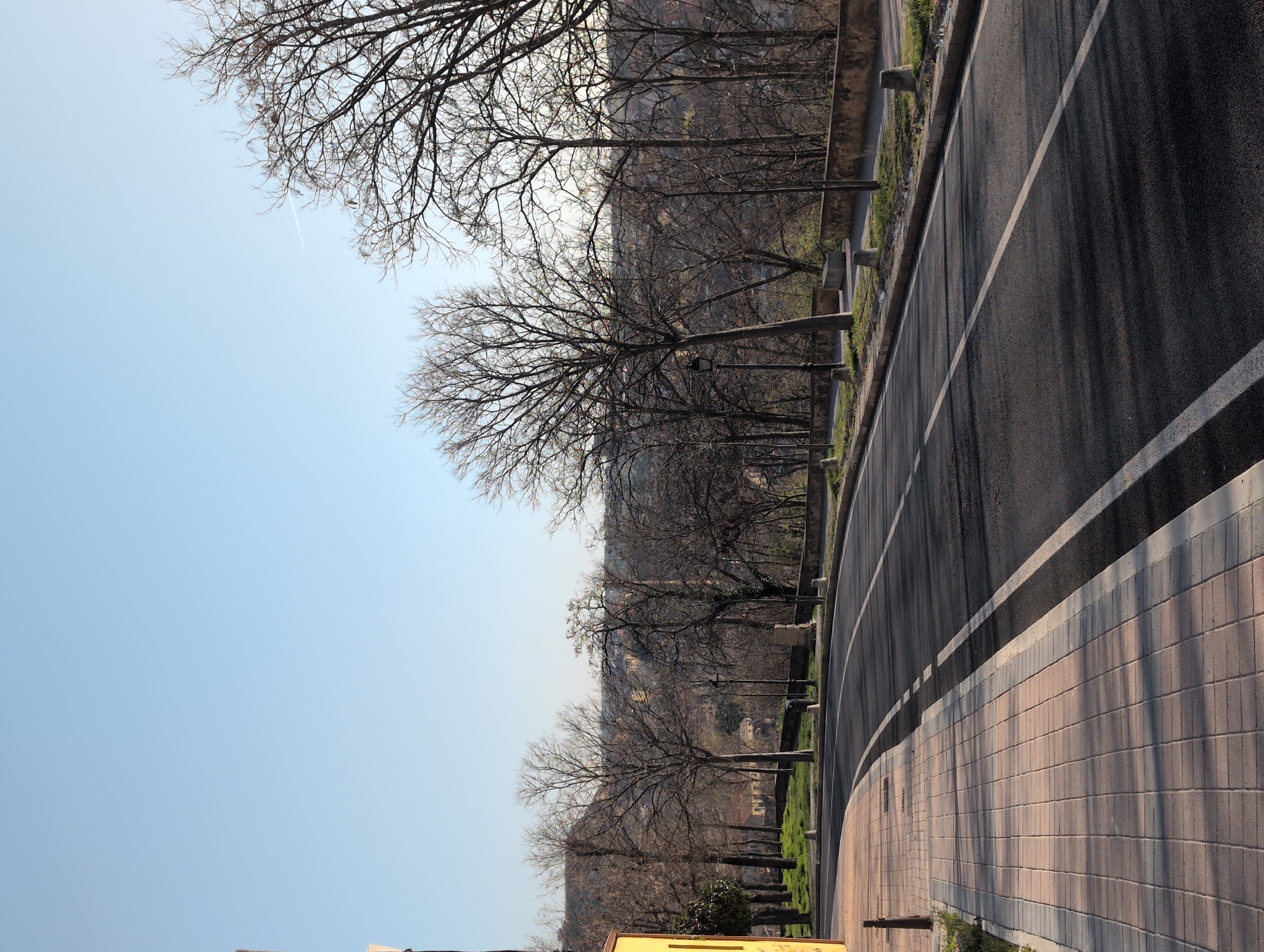 The image displays an urban street scene in Segovia, Spain, under a clear, light blue sky, featuring bare deciduous trees. In the foreground, a light-colored rectangular paved sidewalk on the left curves to the right, alongside a partial view of a yellow building. A dark bollard is positioned on the sidewalk near the curb. The asphalt road, marked with solid and dashed white lines, follows this curve, extending into the midground. No people or vehicles are visible on the road or sidewalk. To the right of the road, a low stone or concrete wall borders a grassy embankment. Numerous bare deciduous trees, indicating a season of late autumn, winter, or early spring, populate this embankment and the area beyond. Several dark-colored streetlights are interspersed among the trees. Further along the right side, beyond the wall, a series of lighter-colored stone bollards and a large, lighter-colored stone block are present. The background consists of densely treed hills or elevated terrain, with distant urban structures visible within the broader cityscape. Long shadows from the trees are cast across the road and sidewalk, suggesting either morning or late afternoon sunlight. A single white contrail is discernible in the upper right portion of the sky.