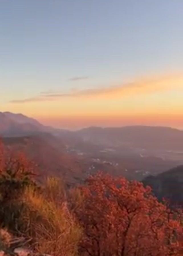 beautiful sunset over a mountainous landscape. The sky is a gradient of blue to orange, with some wispy clouds. The sun is a bright orb on the horizon. The foreground is filled with trees that have autumnal red leaves. The video seems to be taken from a high vantage point, providing a wide view of the mountains and valley below.
