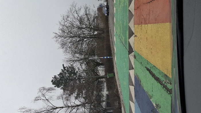 The scene depicts a street view in Sanem, Luxembourg, on an overcast day. The foreground is dominated by a colorful pedestrian crosswalk, viewed from inside a vehicle, with its dark dashboard visible at the bottom. The crosswalk features wide stripes painted in blue, light green, yellow, and red, with black and white triangular patterns bordering the colorful section. The painted surface shows signs of wear and cracking, particularly in the green area. Beyond the main crosswalk, additional green-painted road sections are visible. To the left of the road, a green waste bin is positioned near the curb, adjacent to brown shrubbery. Behind the shrubbery, a white building with dark window frames and a dark roof is partially visible. Several bare deciduous trees and some evergreen conifers line the left side of the road and extend into the mid-ground. A tall grey lamppost stands on the left. In the center, a vertical pole with blue and white stripes is visible, with an indistinct small white square sign mounted on a black pole behind it. The road slopes gently uphill from left to right. On the right side of the road, a dark-colored sedan or hatchback vehicle with its headlights illuminated is observed moving uphill in the distance. Further up the road on the right, another dark lamppost is visible. The sky is uniformly light grey, indicating an overcast condition. No individuals are present in the scene.