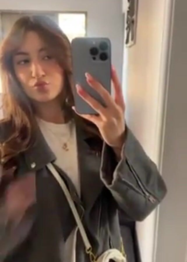A woman is taking a selfie in front of a mirror. She is wearing a white shirt, a grey jacket with zippers, and a white purse with a gold strap. The woman has long brown hair and is wearing a gold necklace. She is holding her phone up and is blowing a kiss to the camera. The mirror is mounted on a wall and there is a white door frame visible to the right. There is a frosted window in the background.