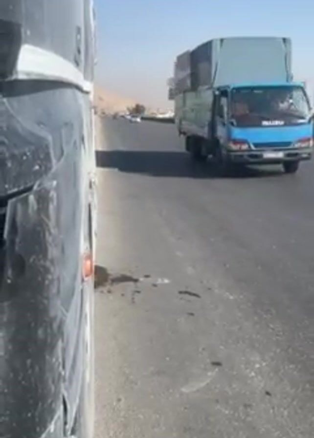 roadside view, presumably from a parked or slowly moving bus. The camera focuses along the side of the bus, partially visible on the left, while a highway stretches to the right. Other vehicles, including a blue truck and several cars, are visible on the road, and a sign is seen in the distance. The environment appears to be a dry, possibly desert-like area, with a hazy sky.