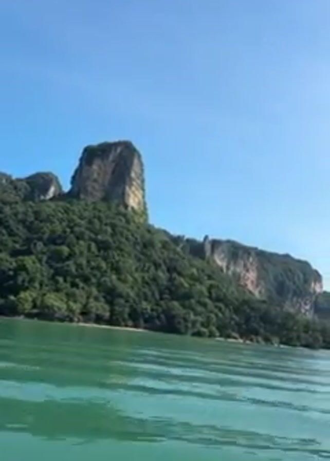 The video depicts a boat ride on a body of water, presumably the ocean, under a clear blue sky. The water is a vibrant shade of turquoise. In the background is a coastline dominated by a large, rocky cliff covered in dense green vegetation. The cliff face is a mix of tan and gray rock formations. The boat moves through the water, creating ripples on the surface. A person's arm briefly appears at the bottom of the frame on the left side.