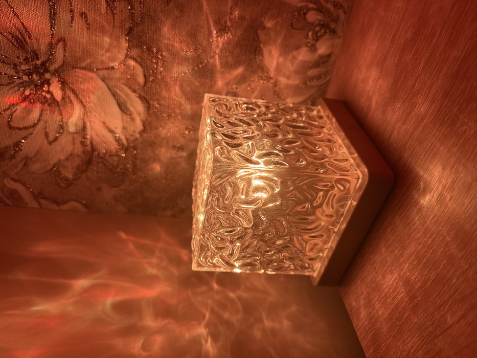 The image depicts an interior scene in Yablonovskiy, Russia. A translucent, cube-shaped lamp with a textured outer casing and a light brown square base is situated on a polished reddish-brown wooden surface. The lamp emits a warm, yellowish-orange light. To the left, a solid reddish-orange wall reflects dynamic, undulating light patterns originating from the lamp. To the right, a wallpapered wall features a subtle floral pattern on a beige-brown background, interspersed with small reflective specks. No individuals or other subjects are present within the frame.