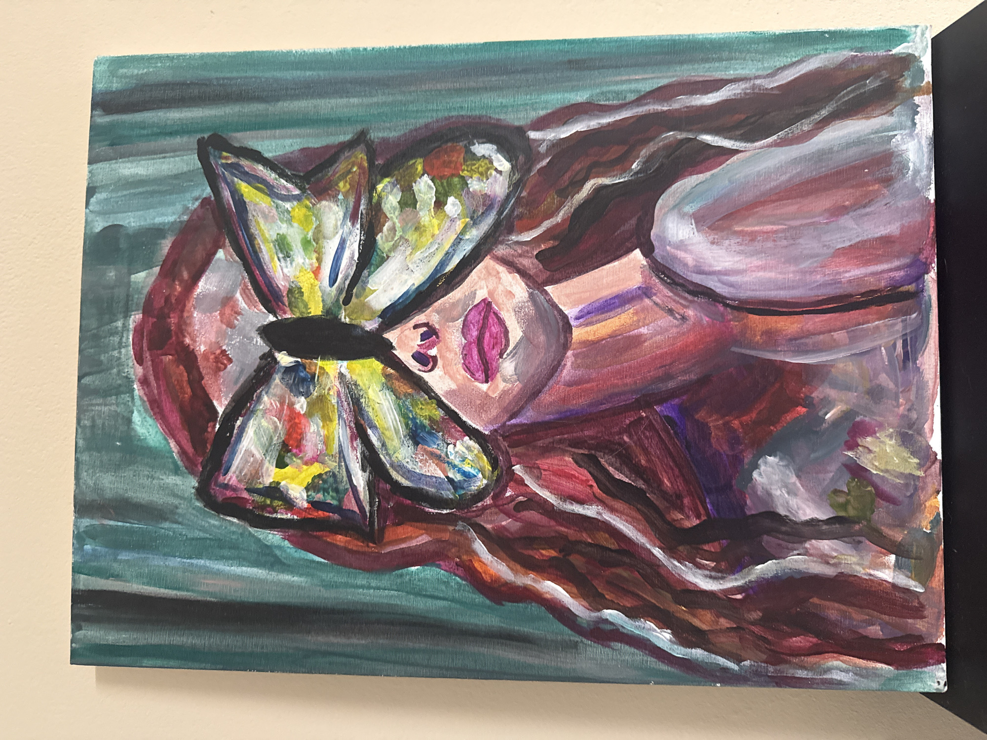 A vertical canvas painting, approximately 60x80 cm, depicting an abstract portrait of a female figure, rests upright against a plain light beige wall, supported by a flat, dark black surface. The painting itself features a figure with long, wavy hair rendered in shades of reddish-brown and white. The figure's eyes are completely obscured by a large, prominent butterfly, painted with a mosaic of bright colors including yellow, red, blue, green, and white, all outlined in black. Below the butterfly, a nose with distinct nostrils and full, magenta-pink lips are visible. The skin is depicted with various strokes of light pinks, purples, and oranges. A portion of the figure's shoulder or upper torso is visible on the lower right, painted in lighter pink and white tones. The background consists of vertical brushstrokes in dark teal and green hues. The scene is located in Sofia, Bulgaria.