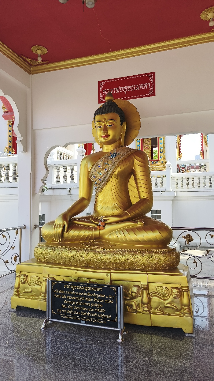 A large, seated golden Buddha statue occupies the central foreground of an open temple pavilion in Pattaya City, Thailand. The statue depicts the Buddha in the Bhumisparsha mudra, with its right hand resting on its knee and fingers pointing towards the ground, and its left hand in its lap. Features include a prominent ushnisha, a serene facial expression, and a circular golden halo behind its head. An ornate, jeweled sash with blue and silver embellishments is draped across the statue's left shoulder and chest. A small, multi-colored floral offering rests on the Buddha's crossed legs. The statue is positioned on a multi-tiered golden pedestal, which is intricately carved with relief designs, including animal figures and geometric patterns. In front of the pedestal, a rectangular black sign with Thai script in gold lettering is displayed on a silver stand. The pavilion features a dark grey polished floor. White columns and walls define the structure, supporting a deep red ceiling bordered by a gilded cornice. Decorative gold accents are present at the ceiling corners. In the background, through arched openings, further white temple structures with traditional Thai red and gold ornamentation and white balustrades are visible under bright daylight. A simple white light fixture hangs from the red ceiling on the left.