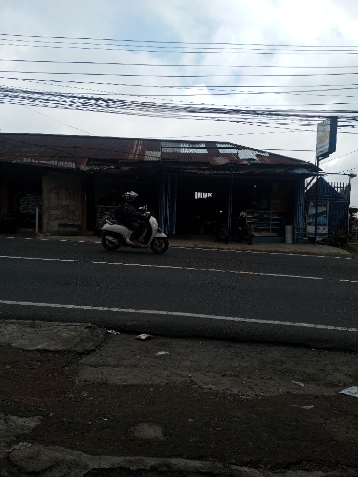 A moped is traveling on a road in front of a rustic building with a corrugated iron roof. Power lines crisscross overhead. The building appears to be a small shop or market. There is trash strewn on the shoulder of the road. The sky is overcast and the overall scene is somewhat gloomy.