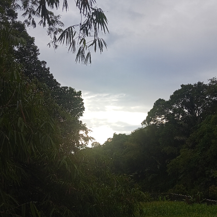 This image displays a dense natural landscape located in Cipanas, Indonesia, under a partially overcast sky. The scene is dominated by dark green vegetation, specifically bamboo foliage in the immediate foreground and left, with its elongated leaves prominently detailed. The midground and background are comprised of a thick canopy of various broadleaf trees, forming a natural V-shaped opening towards the center. Through this opening, a bright, diffused light source, consistent with sunlight, illuminates the clouds and portions of the distant sky. The lower right portion of the image reveals a patch of green grass. A faint, dark horizontal line, possibly a fence or cable, is subtly visible within the vegetation in the lower right quadrant. No human individuals, animals, or direct interactions are visible. The lighting suggests either early morning or late afternoon conditions, with much of the foliage appearing shadowed.