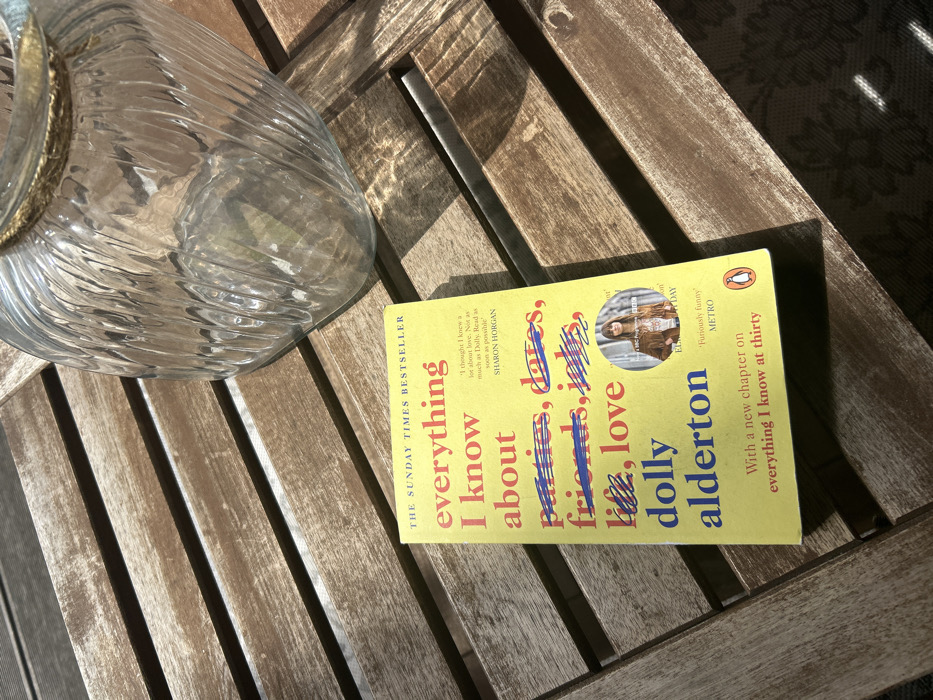 A yellow-covered paperback book titled "Everything I know about parties, dates, friends, jobs, life, love" by Dolly Alderton is positioned on a brown, horizontally slatted wooden surface