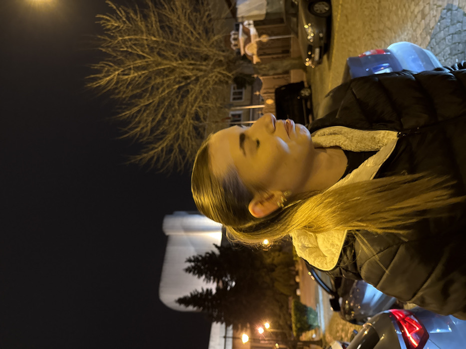 The image depicts a nighttime urban scene in Sliven, Bulgaria, with the Drama Theatre Stefan Kirov prominently illuminated in the far left background. In the foreground, a female individual is positioned to the right, facing right with her eyes closed or heavily downcast. She has light brown hair pulled into a ponytail and is wearing a dark, quilted puffer jacket with a light-colored, possibly sherpa or fleece, lining visible around the collar. A small, light-colored earring is visible on her left ear. The artificial lighting, primarily warm yellow, casts shadows and highlights on her face. Behind the subject, a dark blue vehicle's rear is partially visible. Further back, a street or parking area with cobblestone pavement extends towards the background. Various parked cars are discernible, including a dark minivan/SUV and a silver sedan. To the mid-right, a bare deciduous tree with intricate branching is illuminated by multiple yellow streetlights. In the far background, behind the tree and vehicles, outlines of residential buildings are visible. The main background structure, the Drama Theatre Stefan Kirov, exhibits a distinctive, modern, curved facade, brightly lit against the dark sky. Two dark, conical evergreen trees stand in front of the theatre.