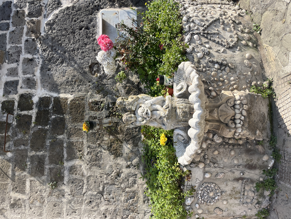 This image depicts a detailed outdoor scene in Sorrento, Italy, centered around a weathered stone fountain against an ancient stone wall. The primary subject is a two-tiered stone fountain. Its upper section features a carved statue of three figures, resembling putti or cherubs. One figure is positioned at the base, appearing to interact with a small animal or object, while two figures above it are depicted in poses covering their ears and mouth, respectively. The fountain's lower basin exhibits a scalloped rim, and its pedestal is adorned with a carved seashell motif and embedded small stones or shells. The fountain is encompassed by a low, curved planter wall constructed from concrete or mortar. This wall is extensively decorated with embedded seashells and various small stones, arranged in geometric and organic patterns, including a notable circular design of shells on the left side. The planter contains vibrant green foliage along with clusters of artificial flowers in white, pink, and yellow. Within the foliage, a small yellow flower pot and two distinct ceramic pots are visible; one contains a single red flower, and the other is a whimsical green and white pot with a cartoonish face. Behind the fountain and planter, a substantial, irregular stone wall rises. It is composed of rough-hewn blocks of varying sizes and shades of grey, joined by visible mortar. A rusted metal hook or bar protrudes from the upper left portion of this wall. To the left of the fountain, a small black pot containing yellow flowers is suspended from a dark pipe or bracket attached to the stone wall. On the right side of the wall, partially obscured by the surrounding flora, a rectangular white plaque with unreadable dark text is mounted; visible phrases include "CONCEZIONE" and "1890 - 1953." The ground in the foreground consists of irregular stone paving or concrete, with small weeds growing in crevices. The scene is brightly illuminated by sunlight, casting distinct shadows on the wall and ground surfaces.