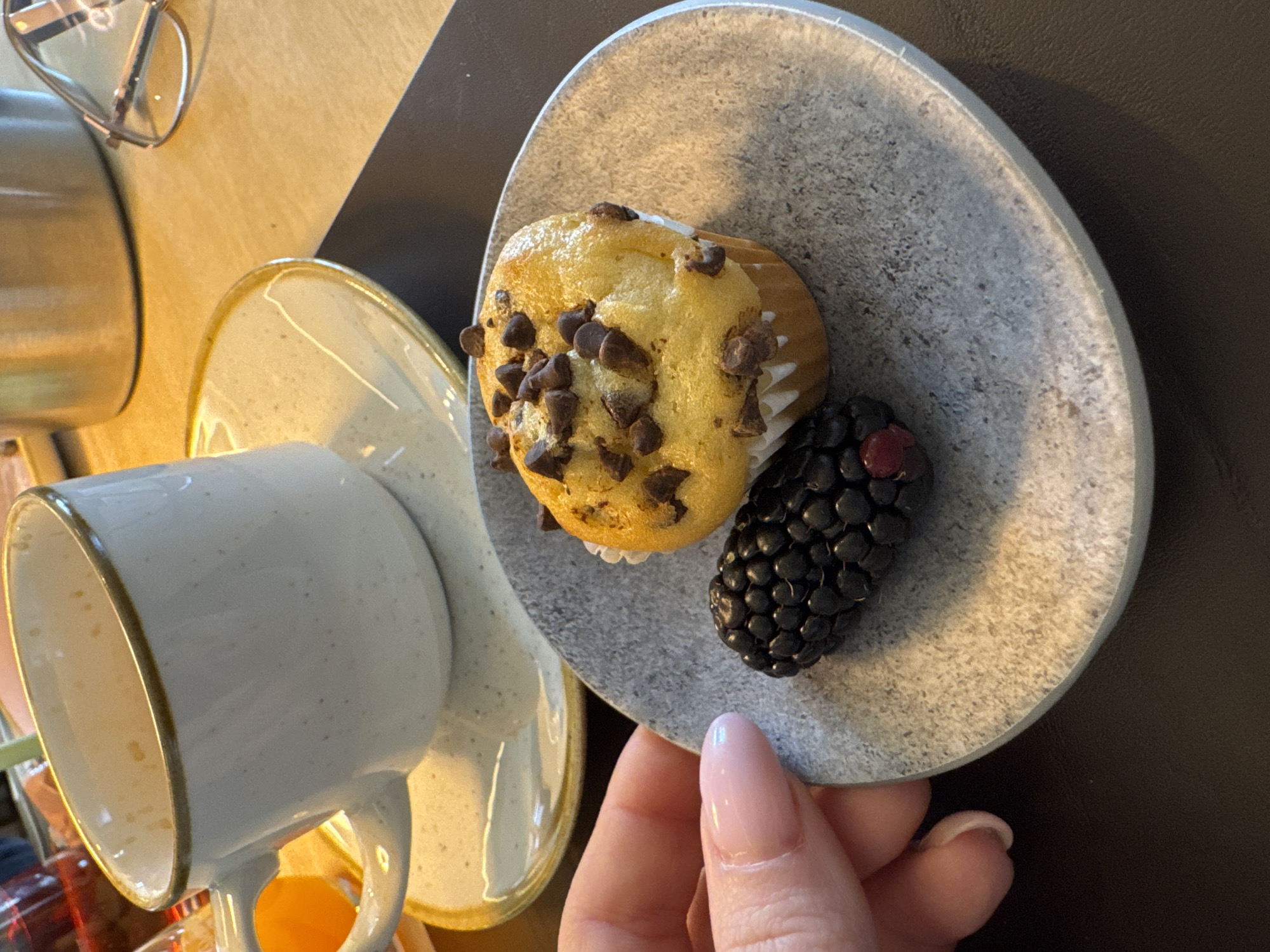 The scene, located in Rimsting, Germany, presents a close-up view of a table setting. A human hand, positioned on the left, with light pink manicured fingernails, holds a circular, gray, textured ceramic plate. On this plate rests one golden-brown muffin, topped with dark chocolate chips and encased in a white paper liner, alongside one dark purplish-black blackberry exhibiting a small reddish section. In the midground, a white ceramic mug with a light brown rim sits on a matching saucer; the mug interior shows residue consistent with prior beverage consumption. The immediate surface beneath the gray plate is black, transitioning to a light brown wooden table surface. Partially visible objects in the background include silver-framed eyeglasses, a metallic cylindrical container, a clear glass holding a red liquid, and a green object, possibly a straw.