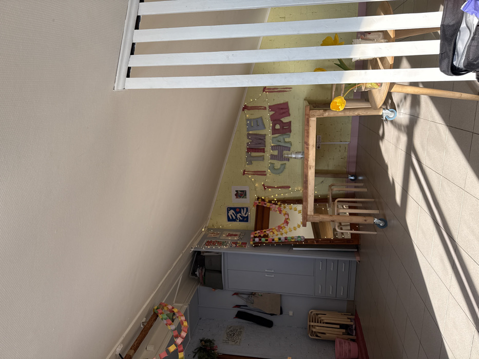 The image displays an interior room located in Chaikovsky, Russia, characterized by an angled, off-white ceiling and light-colored square tiled flooring. Strong, diagonal shadows from an unseen light source are cast across the floor. In the right foreground, a white slatted vertical partition is visible. Adjacent to it, a small, light-colored wooden round table holds a clear glass jar containing yellow tulips and a second clear glass container. A black bag is partially visible at the bottom right corner. Centrally positioned is a rectangular wooden table, equipped with blue caster wheels on its four legs. Four smaller wooden stools, also fitted with caster wheels, are tucked beneath this table. A small silver shaker rests on the table's surface. The wall behind the central table is textured and light yellow. Two banners, constructed from fabric letters, spell "TIME" on the upper banner and "CHARM" on the lower. String lights are draped across this section of the wall. Two framed artworks are mounted on the wall: one featuring blue abstract shapes, and another depicting a floral sketch. To the left of the central table, a tall, grey two-door cabinet with three lower drawers is situated against a darker, textured wall. Leaning against this wall, adjacent to the cabinet, is a full-length mirror with a wooden frame. A colorful paper chain garland is draped over the mirror. Further left, in the background, a stack of several folded wooden chairs is placed against the wall, next to a pink plastic basket on the floor. Items, including a light-colored tote bag, are hanging on the darker wall. Another colorful paper chain garland is strung near the ceiling in this area. No individuals are present in the scene.