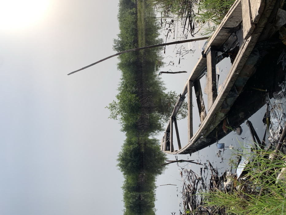 A dilapidated wooden boat lies partially submerged in murky water. Trash and debris surround the boat's edge. A line of trees appears reflected in the water's surface, creating a symmetrical, somewhat distorted image of the landscape. A single branch stretches across the scene. The sky, obscured by mist or fog, allows the sun's light to pierce through. Green vegetation is visible along the water's edge.