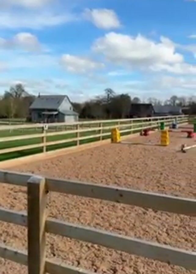 - "sandy riding ring bordered by a light-colored wooden fence" by FM-H3TWA2, licensed under CC BY 4.0
