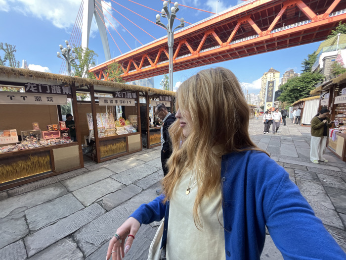 The image presents an outdoor market scene on a paved walkway in Nan'an District, Chongqing, China, beneath a large bridge structure. In the foreground, the right side of a person with long, wavy blonde hair is visible, oriented towards the left. This individual wears a cream-colored top and a partially unbuttoned bright blue long-sleeved cardigan. A gold-colored necklace with a circular pendant is visible. The right hand, extended forward, displays multiple rings, including a red band on the index finger, and light-colored fingernail polish. To the left, a series of market stalls with thatched roofs and wooden frames line the walkway. Each stall bears the Chinese characters "龙门雅集" (Lóngmén Yǎjí). The leftmost visible stall displays small collectible items, while the adjacent stall features various colorful jewelry. A person in a dark shirt is partially obscured behind the first stall. On the opposite side of the walkway, additional similar stalls extend into the background. Several pedestrians are present in the midground and background. One person in a green jacket and light pants examines items at a stall on the right. Another person in a dark jacket and glasses walks past stalls on the left. Buildings and green foliage are visible on a distant hillside. Overhead, a prominent red-orange steel truss bridge, consistent with the Dongshuimen Bridge, dominates the upper background, featuring a white cable-stayed tower and orange suspension cables against a clear blue sky with minimal white clouds. The ground is paved with large, irregular grey flagstones. A grey lamppost with multiple light fixtures stands on the left. The scene is illuminated by bright daylight.