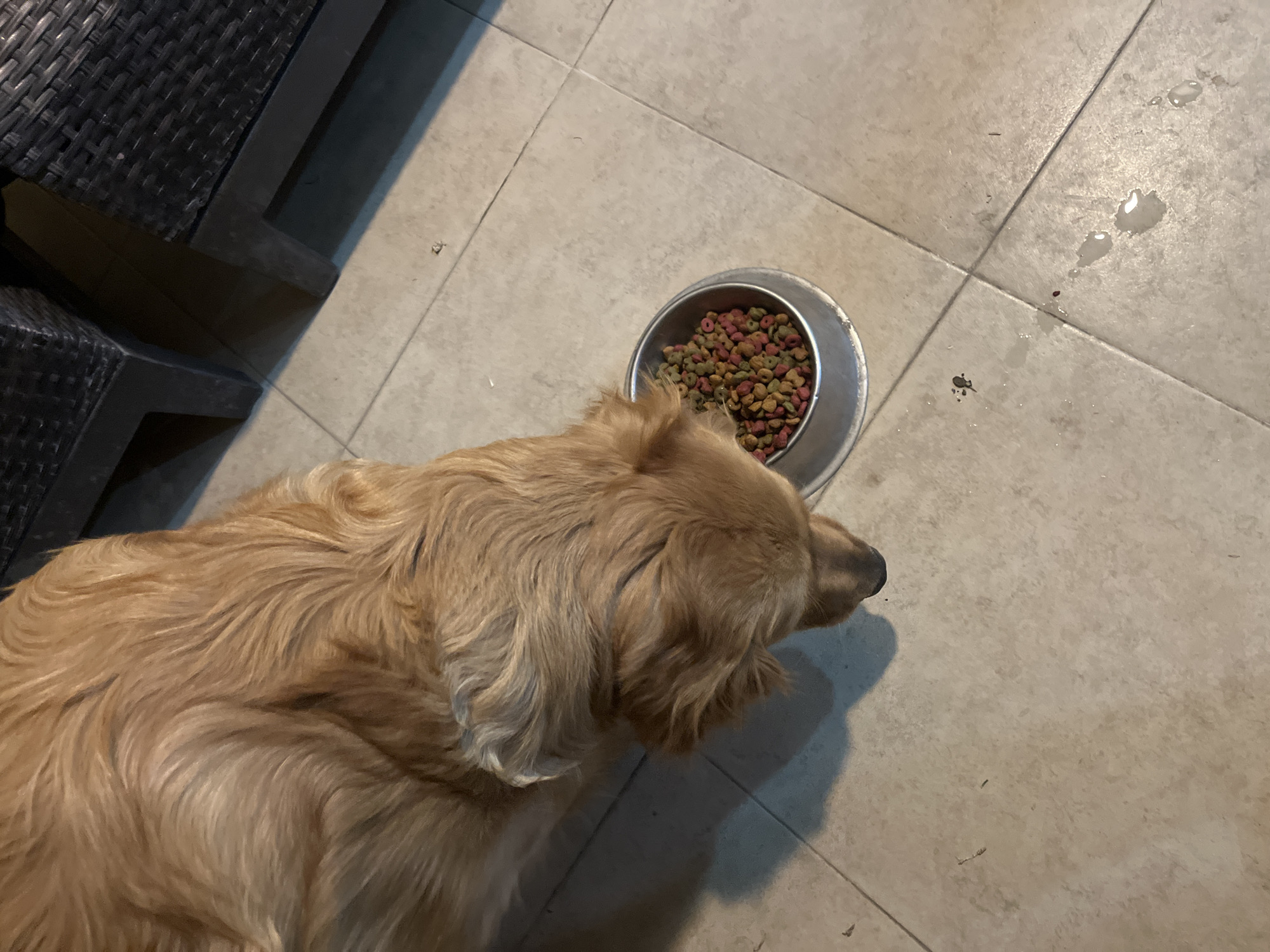 - "A golden retriever dog is depicted from an overhead perspective, with its head lowered into a stainless steel bowl filled with multi-colored kibble, primarily green, brown, and reddish-pink" by FM-0LhgI3, licensed under CC BY 4.0