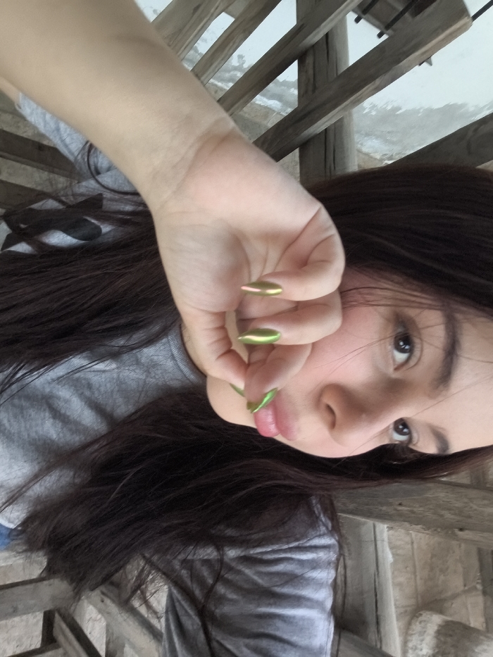 The image is a tilted, close-up portrait of a young female. She possesses long, dark brown hair and fair skin. Her right hand is raised to her face, partially obscuring the left side; her fingers are slightly curled, revealing almond-shaped fingernails with a dual-tone iridescent green and gold metallic polish. Her right eye is open and directed towards the camera, while her lips are slightly parted. She is clad in a grey short-sleeved top, on which a faint, dark, indistinct pattern is discernible on the upper left chest area. The background consists of weathered, grey-toned wooden beams or slats, arranged in a horizontal and diagonal pattern, suggestive of a railing or pergola. Behind this wooden structure, a lighter-toned, possibly concrete or stucco, surface is visible. The lighting is diffuse. The specific location within the city of Juan Griego, Venezuela, cannot be determined from the visual information provided in the image.