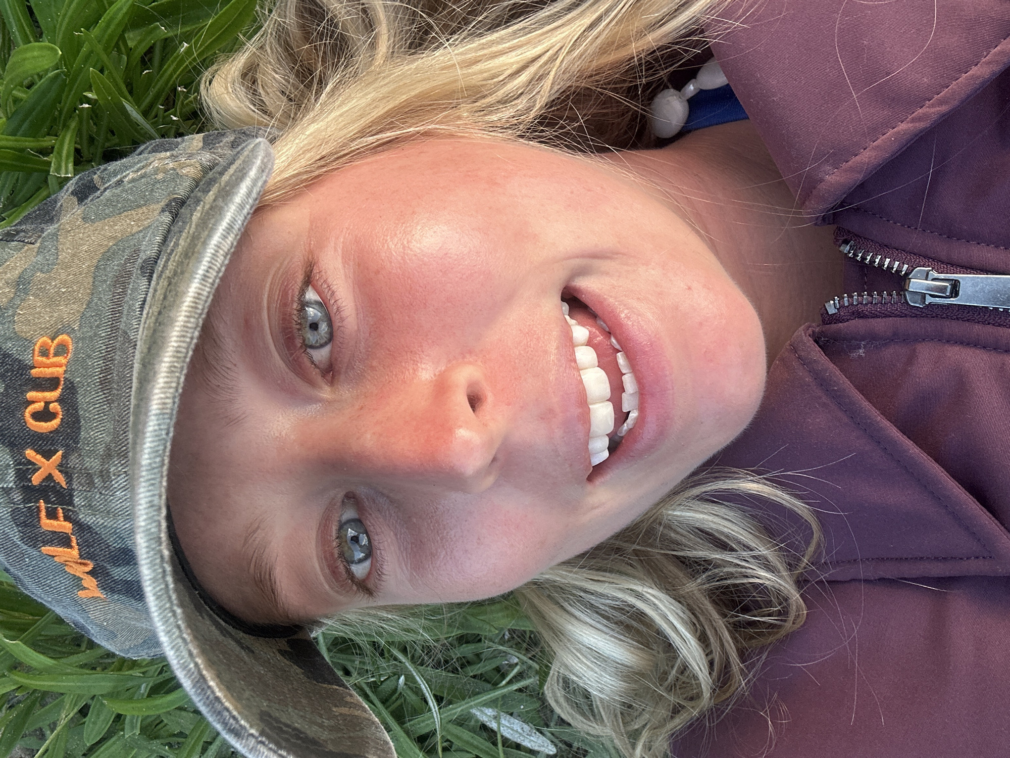A person with fair skin, blonde hair, and blue eyes is lying on their back in a grassy area. They are wearing a camouflage baseball cap with the words "WOLF X CLUB" embroidered in orange. They are also wearing a maroon or purple jacket with a visible zipper. The location is impossible to determine based on the image.