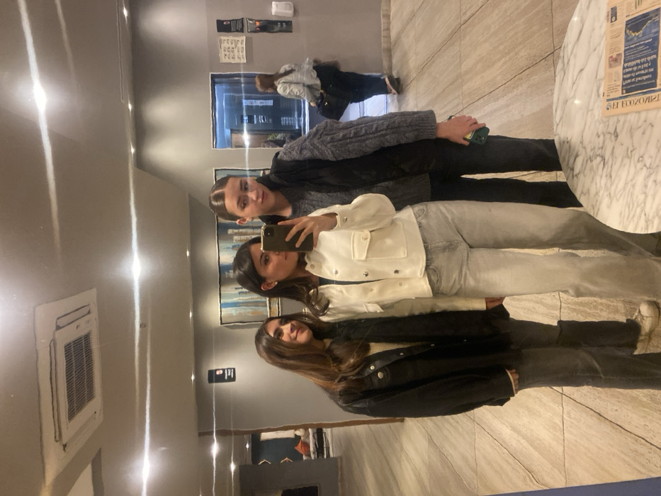 Three young women are posing for a selfie in a brightly lit interior space with tiled floors and mirrored walls. The woman in the middle holds the phone. She's wearing a white jacket and light jeans. The woman above wears a gray sweater and black jacket, while the woman below wears a black jacket. A marble table with a newspaper on it is visible in the background. Another person stands further back by an open door. An air conditioning unit is visible on the wall.