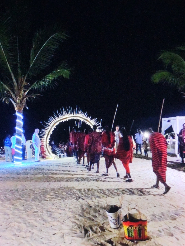 This image depicts a nighttime outdoor event on a sandy area resembling a beach, flanked by palm trees. The environment is inconsistent with the inland city of Dodoma, Tanzania, suggesting a coastal or beach-themed setting. In the foreground, two decorative buckets rest on the sand; one is white with black text, and the other is a colorful, patterned basket-like container. The ground is light-colored sand with visible footprints and undulations. In the mid-ground, a procession of approximately eight individuals, predominantly male, walks from right to left in a line. They are dressed in red, patterned shukas or cloths reminiscent of Maasai attire, and most carry slender staffs. They appear to be approaching or passing through a large, circular archway illuminated with numerous small white lights, creating a spiky, radiant effect. To the far left, a palm tree is wrapped with vibrant blue string lights. Several individuals in contemporary clothing are standing near this tree, observing the scene. One man in a light-colored shirt is prominent. Further back, another group of people is visible near the archway and beyond it. To the far right, part of a white tent or canopy structure is visible. The sky is dark, indicating night. Artificial lighting illuminates the immediate area and the main subjects.