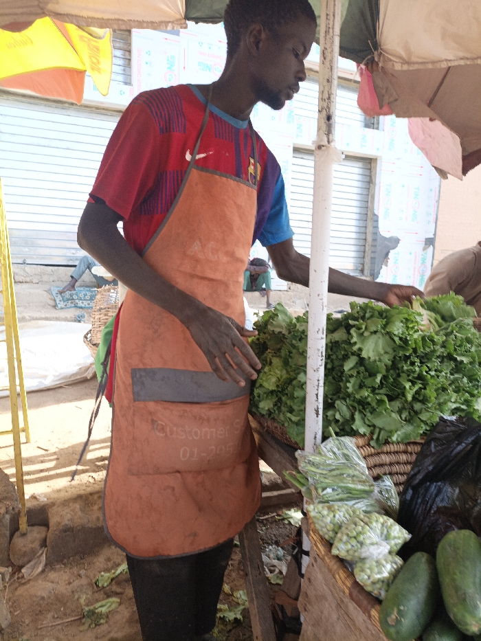 The scene depicts an outdoor market stall in the city of Kawaji, Nigeria, under bright daylight. A dark-skinned adult male stands partially obscured, facing right and slightly downwards, tending to a display of fresh produce. He wears a multi-colored short-sleeved t-shirt (red, blue, purple with a white Nike swoosh and "FCB" logo) and an orange apron with grey accents, bearing the text "A.C." on the upper section and "Customer S" and "01-295" on the lower front. His hands are positioned near a large quantity of dark green leafy vegetables, possibly lettuce, piled in a woven basket on a wooden stall. Adjacent to this, several clear plastic bags containing green peas or beans, and multiple green, elongated fruits or vegetables resembling unripe papayas, are visible on the stall. A black plastic bag is also present on the stall's right. Overhead, a beige and yellow fabric awning provides shade, supported by a white pole. The ground is dirt, with scattered green leaf fragments. In the background, two individuals are partially visible: one seated on a mat next to a woven basket on the left, and another figure hunched or seated low in the center-right. A light-colored building with corrugated metal shutters or panels, some labeled "TIN-ME," forms the immediate backdrop.