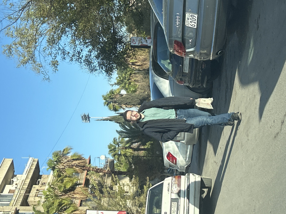This image depicts an outdoor street scene in Rukn ad-Din Municipality, Syria, under a clear blue sky with strong sunlight casting distinct shadows. A male pedestrian, appearing to be a young adult or middle-aged, walks on the paved street in the center-left foreground, moving towards the viewer's right. He has short dark hair, a beard, and wears eyeglasses. His attire consists of a dark-colored, long-sleeved jacket worn over a light green collared shirt, blue jeans, and dark athletic shoes. He holds a folded, light-colored item, possibly paper or a small bag, in his left hand, which hangs at his side. He looks generally forward. Multiple vehicles are parked along the street to the pedestrian's right and behind him. On the far left, the rear section of a white sedan is visible, displaying a Syrian license plate with the number "٦١٤ / ٤٩٩". On the far right, the rear of a grey Audi sedan is present, showing a Syrian license plate with the number "٦١٧ / ٦١٠٩". Between these vehicles and behind the pedestrian, several other parked sedans are visible. The environment includes a multi-story concrete building with balconies on the left, behind a row of tall palm trees. Numerous palm trees and other deciduous trees with green foliage are distributed across the mid-ground and background. A tall, metal light tower, consistent with stadium lighting, is visible in the distant background above the tree line. A partially obscured red and white sign is present on the left near the building, and another partially obscured sign with Arabic text is on the right, behind the parked cars. The ground is paved, showing some surface irregularities and tire marks.