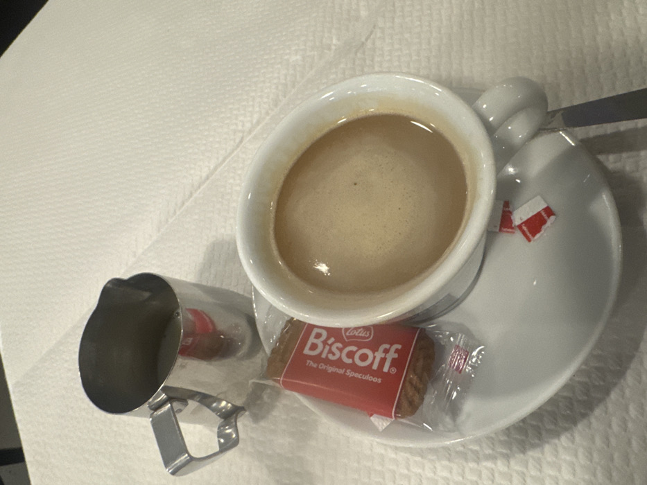 This image depicts a table setting at an unspecified indoor location in the city of Strasbourg, France. The primary subjects are a white ceramic espresso cup and matching saucer, a small stainless steel creamer pitcher, and a single Lotus Biscoff biscuit. The espresso cup, positioned centrally on the saucer, contains a light brown beverage with a thin layer of crema. A metallic spoon handle is partially visible beneath the saucer. To the left and slightly behind the cup and saucer, the stainless steel creamer pitcher contains a small amount of white liquid. Resting on the saucer next to the espresso cup is a single Lotus Biscoff biscuit, enclosed in its original red and clear plastic packaging. Scattered on the saucer, near the cup, are several small, torn red and white paper fragments, consistent with remnants of a sugar packet. The entire arrangement rests on a textured white surface, possibly a placemat or tablecloth. There are no individuals visible in the scene.