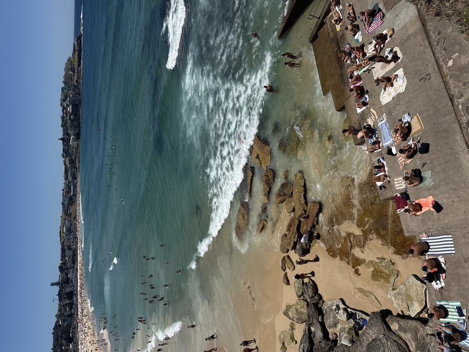 Aerial view of a crowded beach on a sunny day. Waves crash along the shoreline where numerous people swim. Others sunbathe on the sand and a concrete platform, while a few explore rocky areas. Buildings line the beach in the distance.
