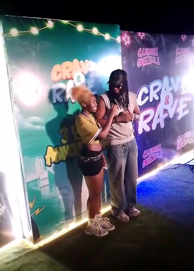 . Two people, one woman and one man, are standing in front of a backdrop for an event. The backdrop reads “Crave & Rave” and “Candies & Cocktails.” The woman is younger with blonde hair styled up, wearing a yellow shirt and black shorts. The man is older with dreadlocks, wearing a tank top, jeans, and a hat. They are both smiling and talking into a microphone. The area is lit up with bright lights. There is a green carpet underfoot, and the event seems to be taking place outdoors at night.