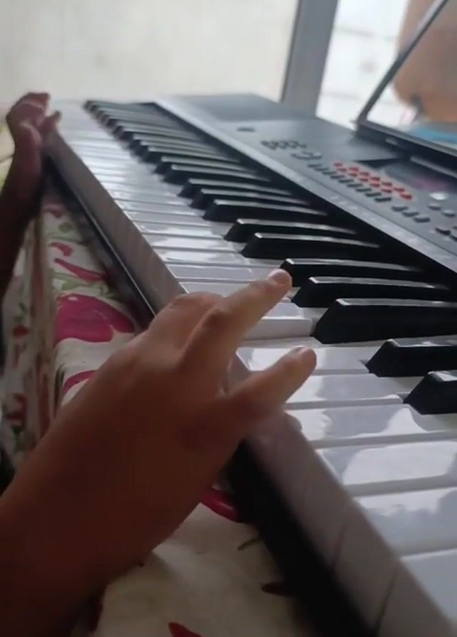 - "A young child with brown hair and eyes, wearing a white tank top, is playing a black and white electronic keyboard" by FM-ePb6o2, licensed under CC BY 4.0