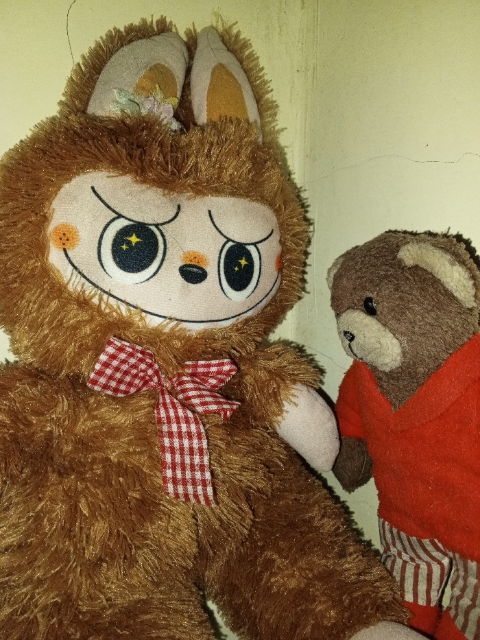 The image depicts two plush toys positioned in the corner of a room in Bayawan, Philippines